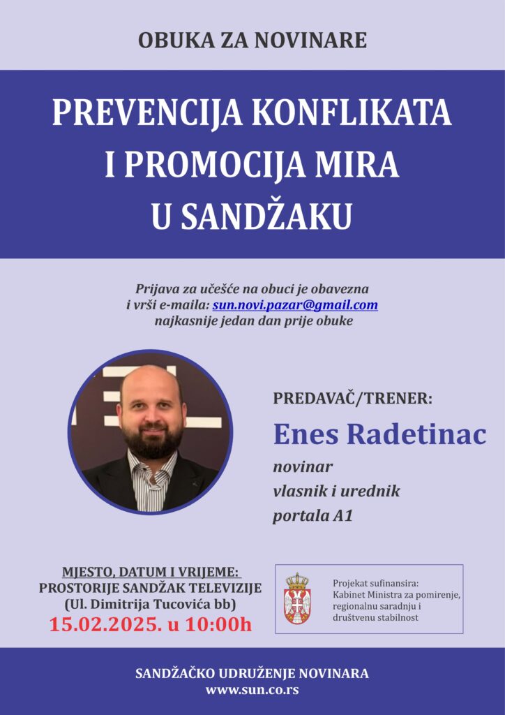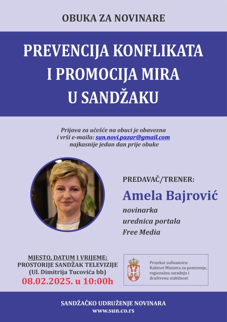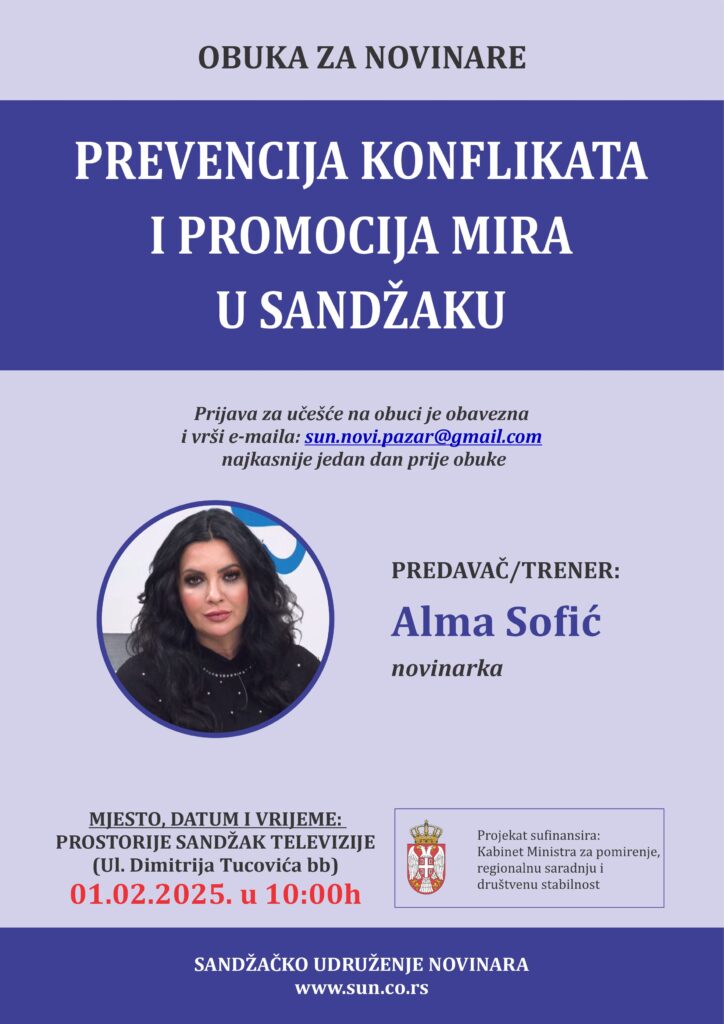 U organizaciji Sandžačkog udruženja novinara, u prostorijama Sandžak televizije održana je poslednja obuka za novinare u okviru projekta “Prevencija konflikata i promocija mira u Sandžaku”.